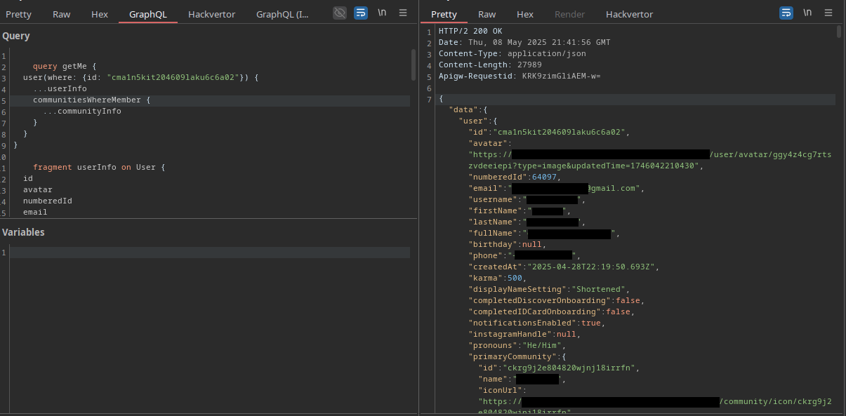 Some time later, I continued exploring and found that I can query other user’s information. All user IDs are quite random, but the IDs get leaked in other places in the app, for example when sending messages. Therefore, I could find some ID and get the info of the person who sent the message: